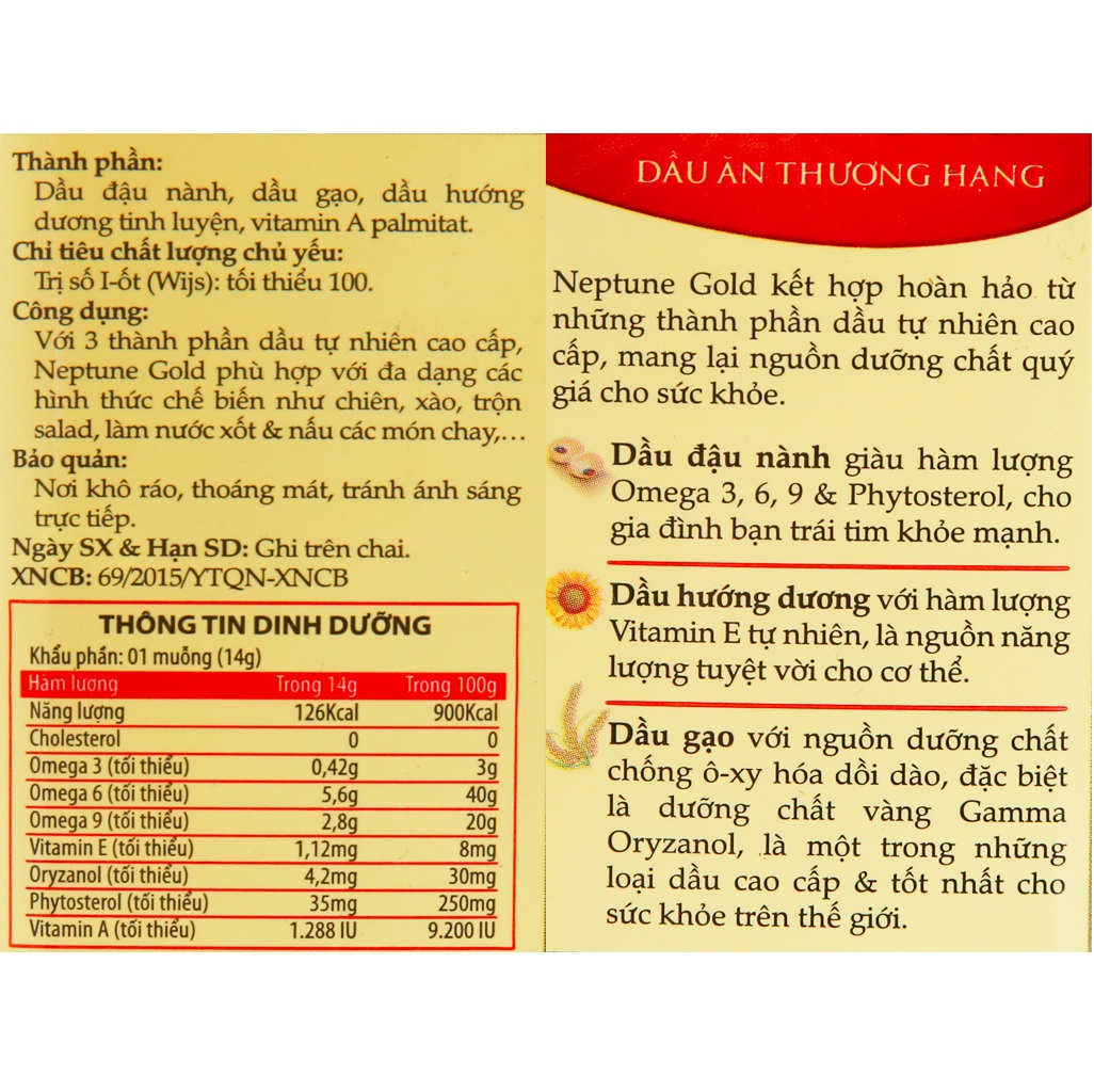 Dầu ăn thượng hạng Neptune Gold là sự kết hợp hoàn hảo từ những thành phần dầu tự nhiên: dầu đậu nành, dầu hướng dương và đặc biệt là dầu gạo, mang lại nguồn dưỡng chất quý giá cho sức khỏe. Dầu đậu nành giàu hàm lượng omega 3, 6, 9 và Phytosterol cho gia đình bạn trái tim khỏe mạnh. Dầu hướng dương với hàm lượng Vitamin E tự nhiên là nguồn năng lượng tuyệt vời cho cơ thể. Dầu gạo với nguồn dưỡng chất chống ô-xy hóa dồi dào, đặc biệt là dưỡng chất vàng Gamma Oryzanol là một trong những loại dầu cao cấp và chất lượng cho sức khỏe trên thế giới.