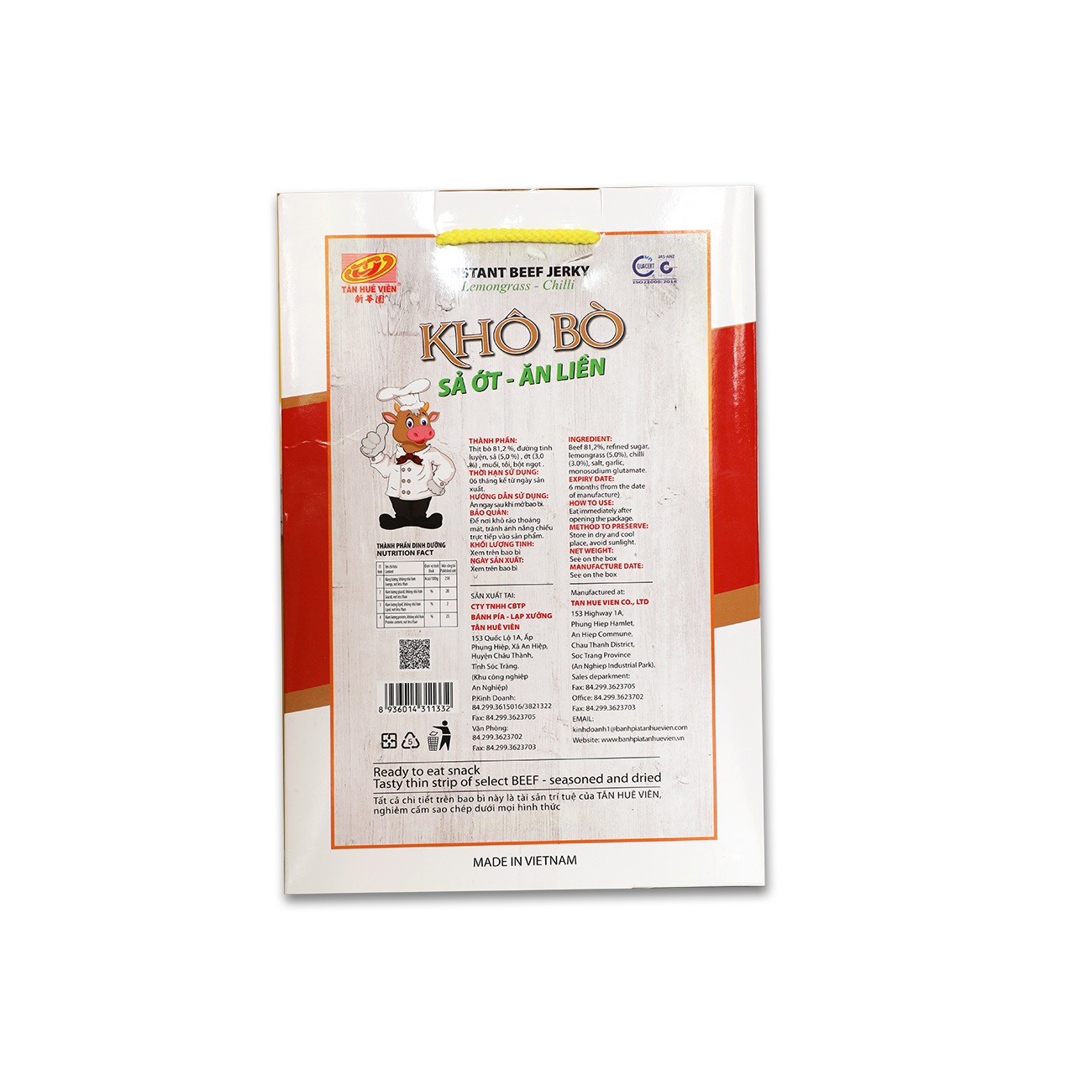 Ngoài ra, khoáng chất trong thịt bò giúp phát triển cơ bắp và nhiều tác dụng khác. Với sản phẩm khô bò sả ớt ăn liền của công ty Tân Huê Viên, các bạn hoàn toàn yên tâm về chất lượng sản phẩm vì Tân Huê Viên là cơ sở sản xuất nổi tiếng và uy tín tại tỉnh Sóc Trăng. Bạn hoàn toàn yên tâm tin dùng sản phẩm tại nhà hoặc mua về để làm quà biếu.